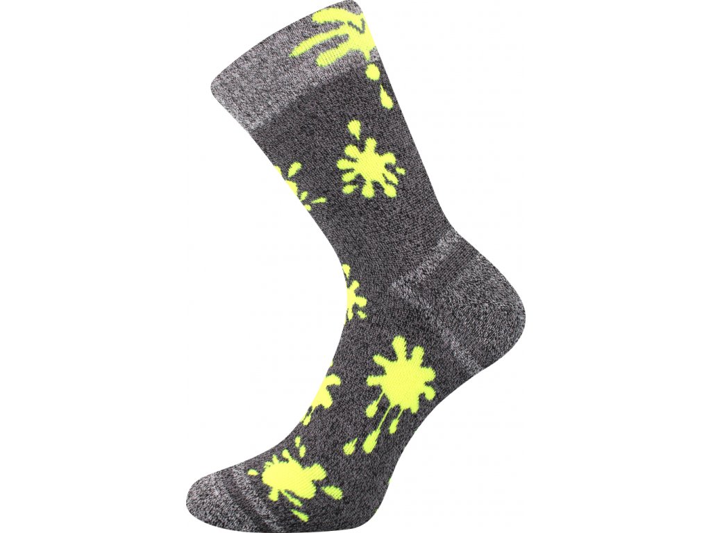 Barva a dekor ponožek - šedá melé se stříkanci barvy - modrá, neon zelená, neon žlutá